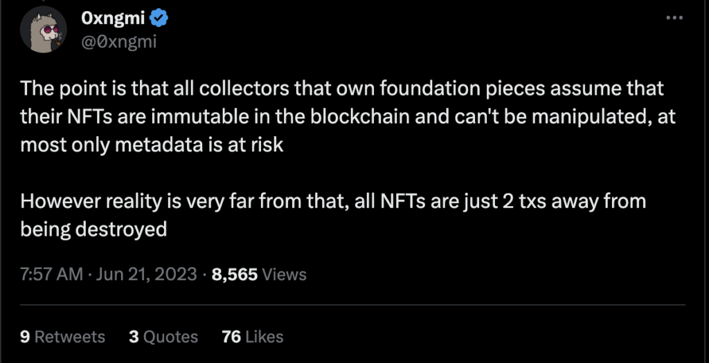 While NFTs are supposed to be immutable, 0xngmi argues that the NFTs minted using Foundation’s contracts “are just two transactions away from being destroyed.”