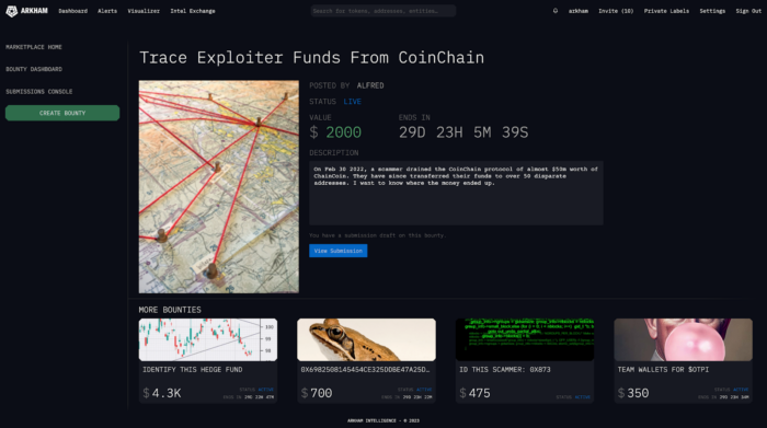 Taking a page out of the contemporary cybersecurity industry, Arkham’s platform allows users to issue a “bounty” for intelligence by locking funds in a contract. These bounties can then be claimed by “bounty hunters” — a.k.a blockchain developers and analysts — who are empowered to offer the requested information in exchange for the staked payment.