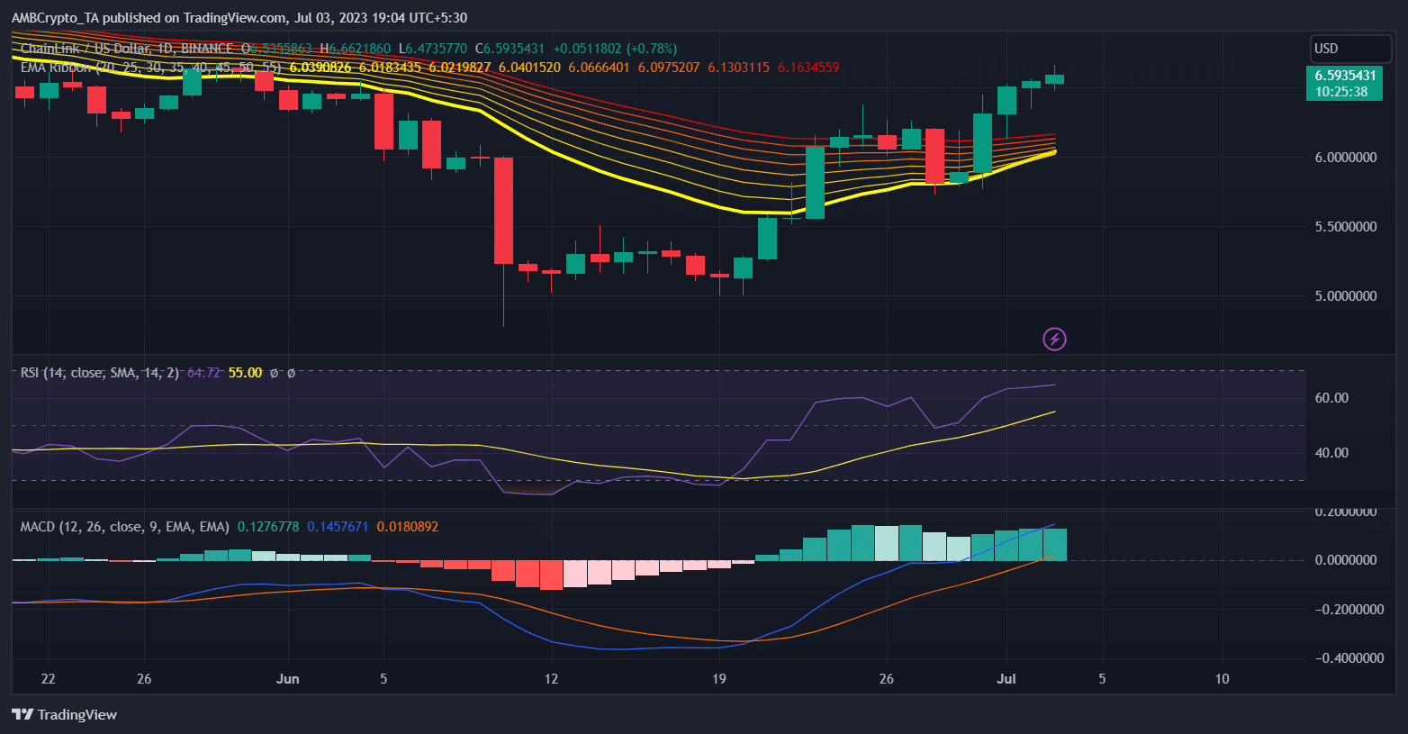 - LINK’s EMA Ribbon displayed the possibility of a bullish crossover