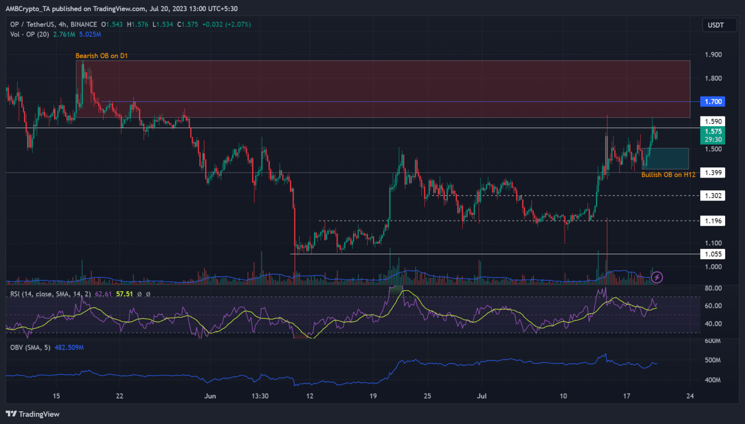 The $1.59 level was a key support in mid-January and May. But there has been critical resistance recently, setting OP to consolidate below it in the past five days. Above $1.59 lays another hurdle, a bearish order block (OB) of $1.63 – $1.88 (red) on the daily chart.