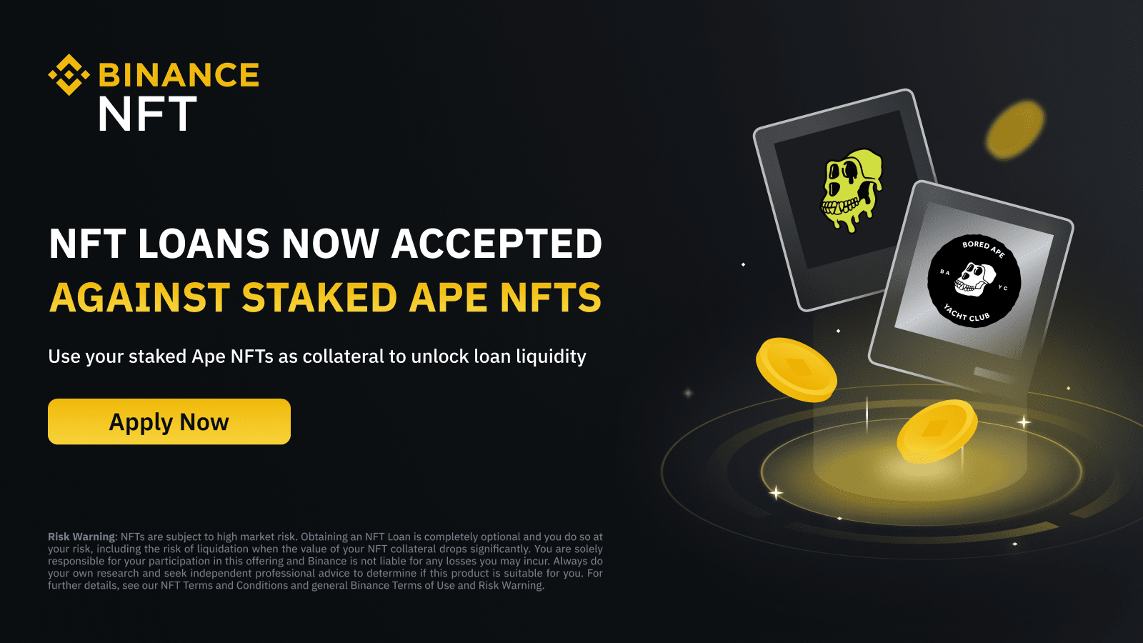 This introduces more flexibility for Binance NFT users, who can now stake their existing BAYC and MAYC NFT collateral on NFT Loan via the Ape NFT Staking Program to earn ApeCoin (APE) daily rewards, or gain access to higher liquidity by completing an NFT Loan with a staked BAYC NFT or MAYC NFT.