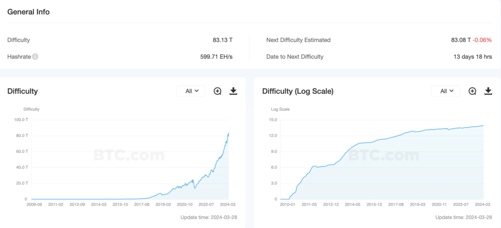 The average hashrate for the period since the previous value change was 599.71 EH/s. The range between blocks is 10 minutes and 7 seconds. Mining difficulty determines the required total hardware capacity for mining Bitcoin (BTC). An increase in this indicator brings the halving date of the first cryptocurrency closer. Under certain conditions, it may occur in April 2024.