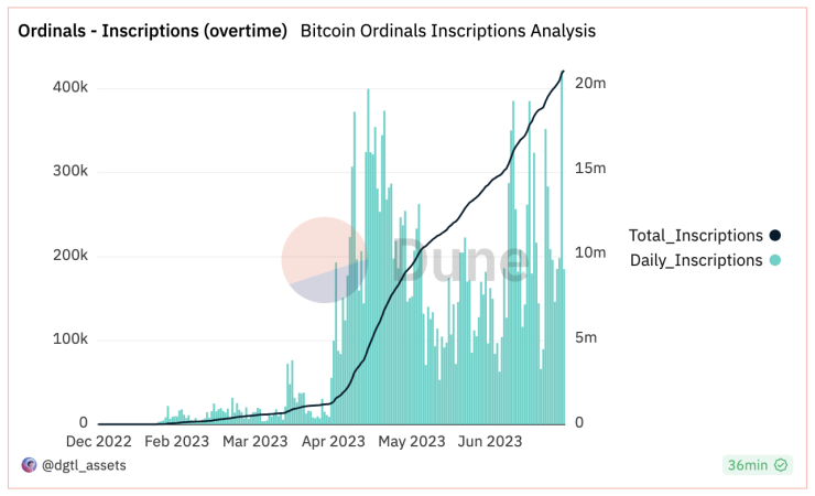 Even though July 30 saw a new daily record with more than 422,000 inscriptions, according to a Dune Analytics dashboard, sales volumes for the Bitcoin NFTs are on pace to finish nearly 50% lower than last month.