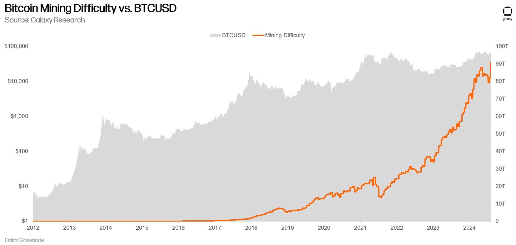 Yesterday, Aug. 1, 2024, Bitcoin (BTC) mining difficulty reached a historic peak following a significant increase of 10.5%, reports Galaxy’s Head of Research Alex Thorn. In percentage terms, this rise is the 24th largest since 2016, the 73rd since 2012 and the 119th largest of all time. However, in absolute terms, says Thorn, this marks the largest difficulty increase ever recorded.