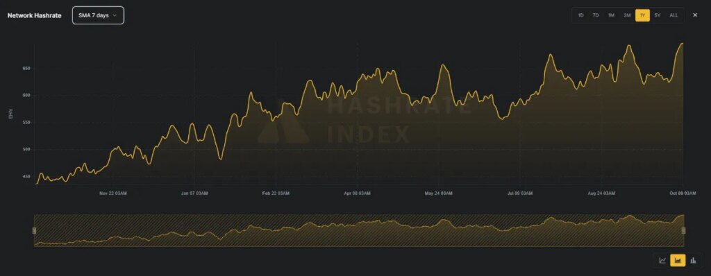 Data from the Hashrate Index suggests that the Bitcoin network Hashrate has surged from 625 EH/s recorded on October 1st to 697 EH/s recorded on October 9th, the highest in history. The Bitcoin network Hashrate had previously hit a new all-time high of 693EH/s on September 9th before falling to a low of 621EHS on September 17th.
