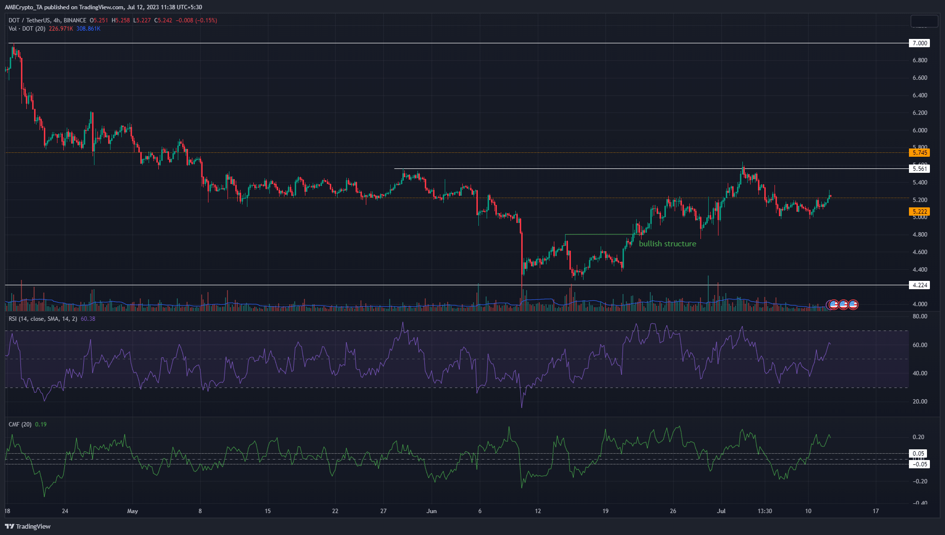 Another sign of bullish momentum can be seen on the price action itself. After dropping to the $5 level on 7 July, DOT consolidated there till 10 July before climbing back to the short-term resistance at $5.22.