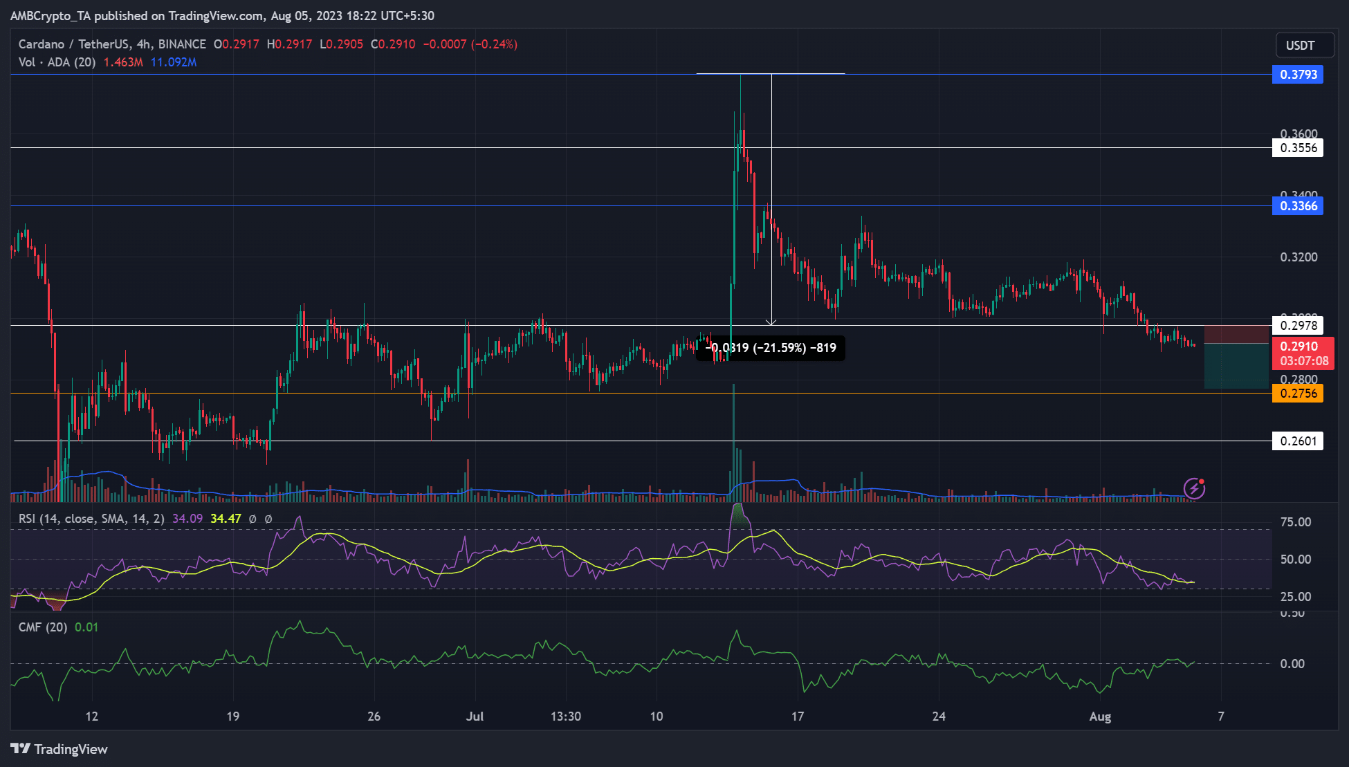 Bitcoin’s [BTC] continued weak price action has exposed most altcoins to record losses, presenting shorting opportunities along the way. In particular, Cardano [ADA] shed over 20% after dropping from mid-July’s high of $0.38 to <$0.30 at the press time.