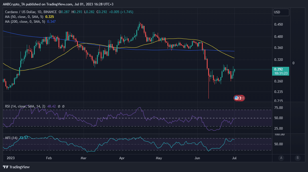 ADA kicked off this week on a bearish leg but managed to achieve a mid-week bounce. It exchanged hands at $0.29 at the time of writing, which represents a 33% upside from its lowest price in June.