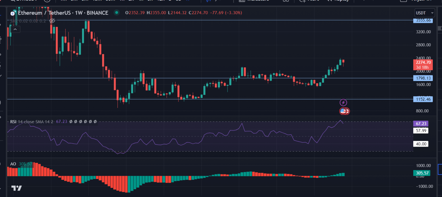 ETH was trading at $2,287, at press time, following a hike of 1.96% over the past week of trading. Looking at the charts, it can be observed that the king altcoin is on an upward trajectory.