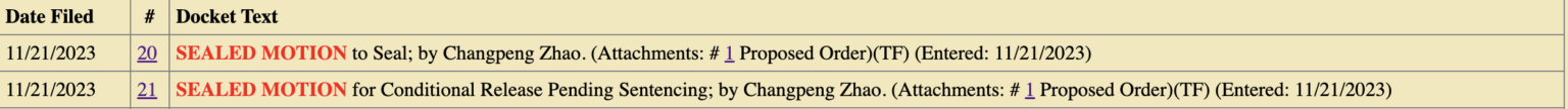 According to court records, lawyers representing Binance and CZ appeared in court for separate hearings scheduled on the morning of Nov. 21 to discuss pleas and possible detention. Attorneys for CZ filed sealed motions concerning the Binance CEO’s conditional release pending sentencing in the case, but the contents were not available at the time of publication.