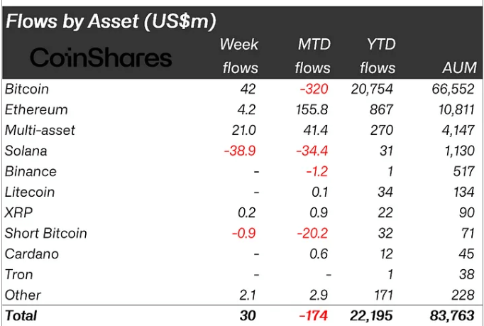 Crypto investment products experienced a lukewarm performance last week, with modest inflows of $30 million, according to CoinShares weekly report.