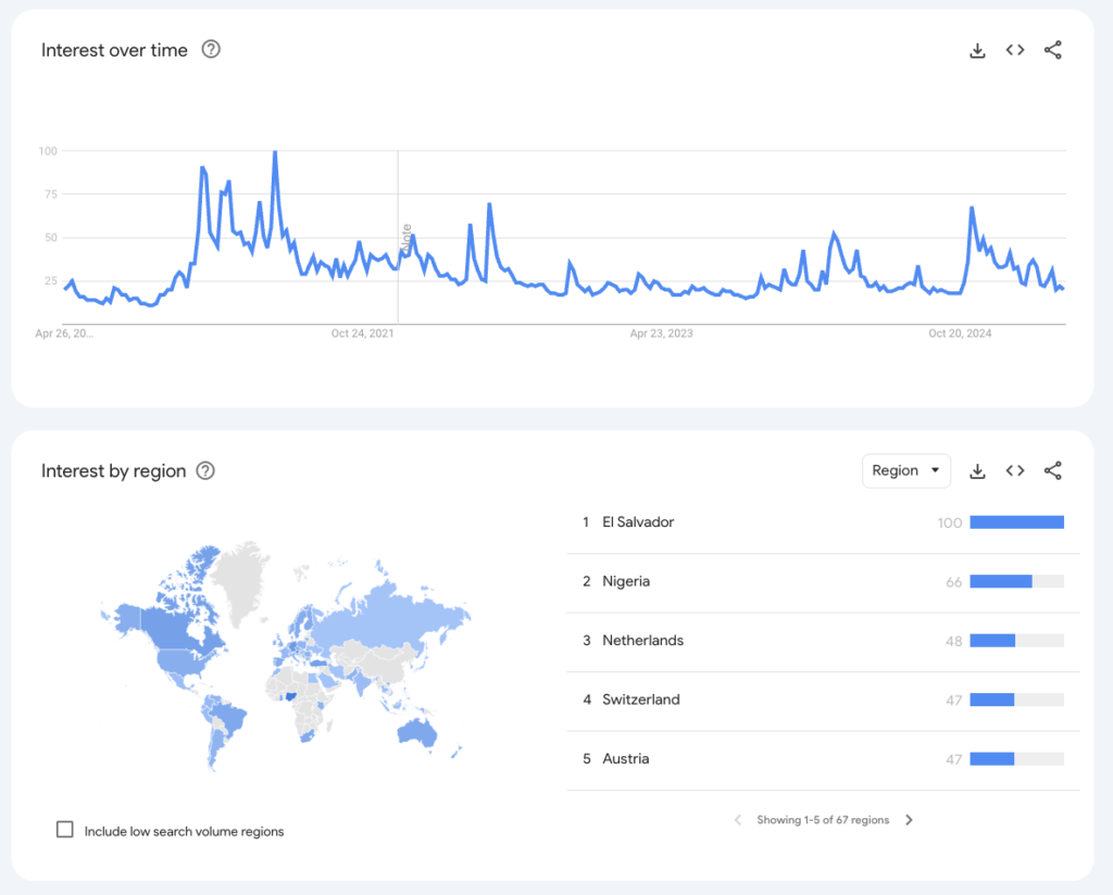 However, global interest in Bitcoin may not mimic data seen in Robinhood’s data. Searches for Bitcoin on Google Trends are near five-year lows, with the top countries being El Salvador, Nigeria, and the Netherlands. The United States is way down the list at number 28, just behind the UK.