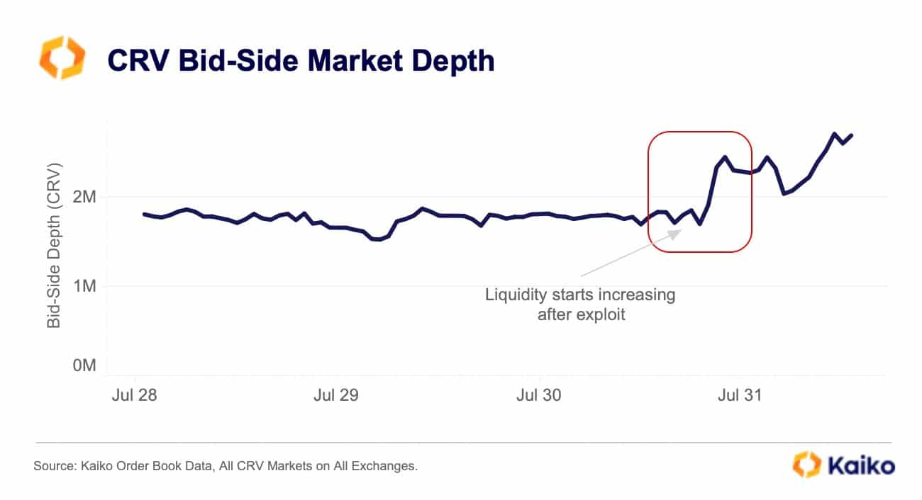 In a recent data report by Kaiko, it was revealed that as news of the Curve Finance hack spread, there was a noticeable rise in bid-side liquidity on centralized exchanges. Bid-side liquidity refers to the total volume and depth of buy orders available at different price levels for CRV, indicating the eagerness of buyers to acquire the cryptocurrency at various market prices.