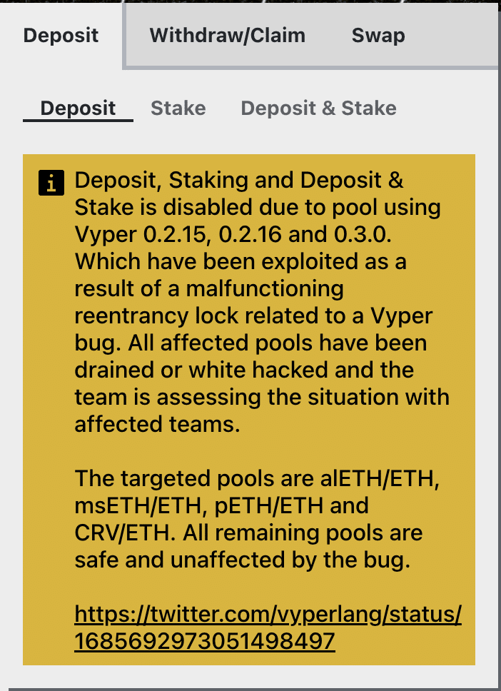 On 30 July, Vyper confirmed that the 0.2.15, 0.2.16, and 0.3.0 versions of its compiler failed to properly implement reentrancy lock.