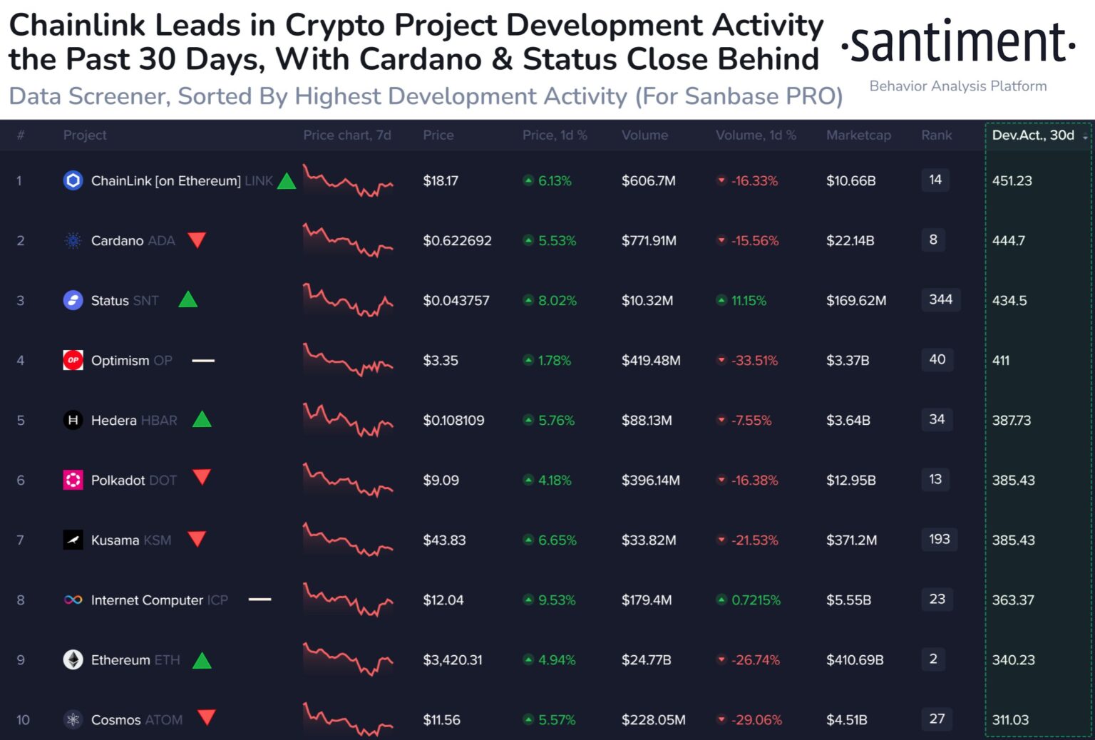 The decentralized oracle network Chainlink (LINK) is ahead of all other crypto projects in terms of recent development activity, according to the analytics firm Santiment.