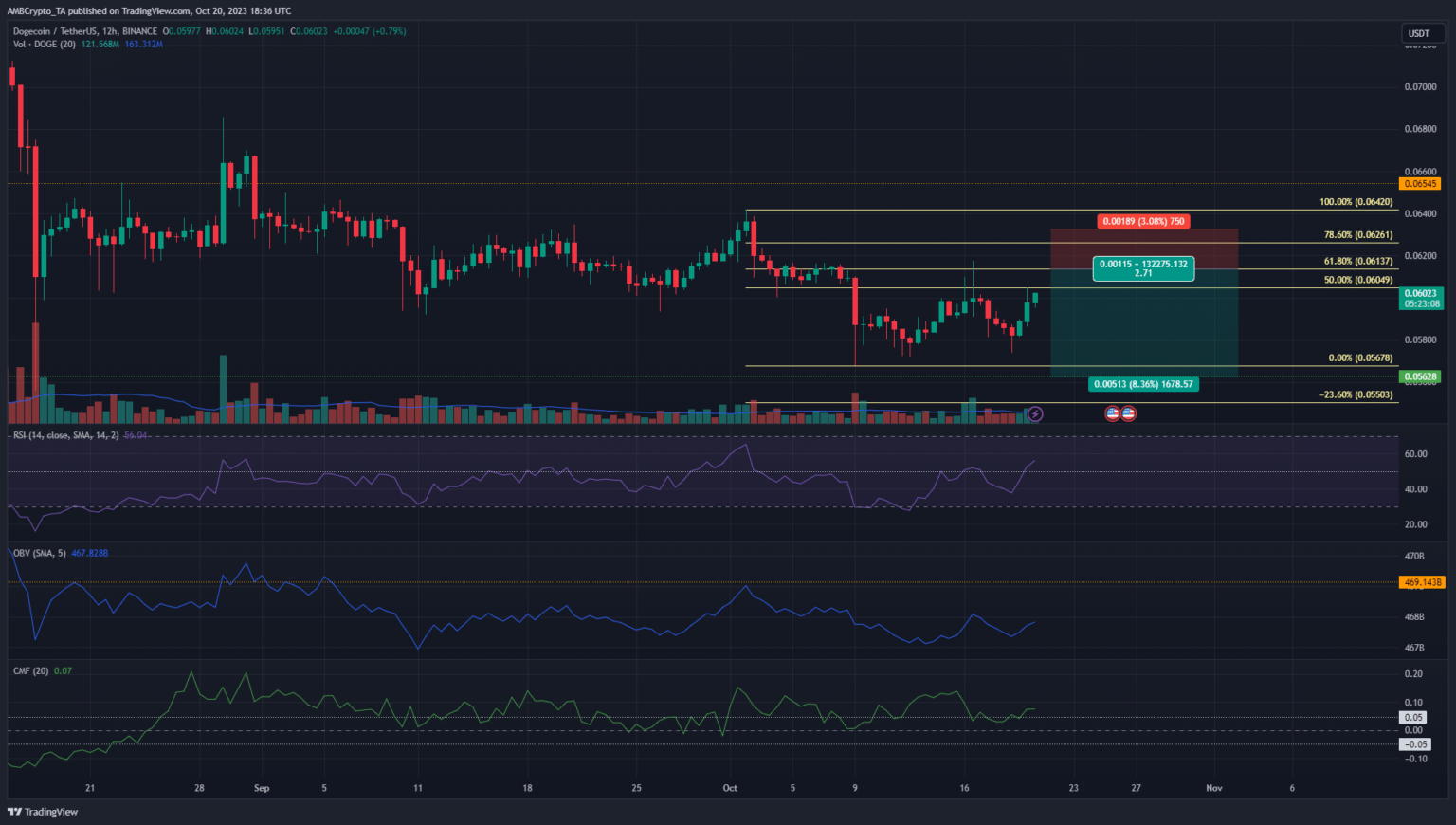 Dogecoin [DOGE] had a technical bullish structure but the chart suggested that DOGE could trade within a short-term range in the coming days. Despite the short-term gains of the past two days, evidence suggested the bulls would likely be unable to sustain the pressure.