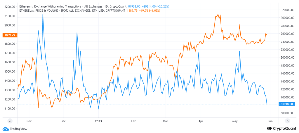 Moreover, analyzing on-chain data, Ethereum’s withdrawing transaction metric has been declining following ETH’s recent big red candle. The metric is currently at 81K level which was last seen in January.
