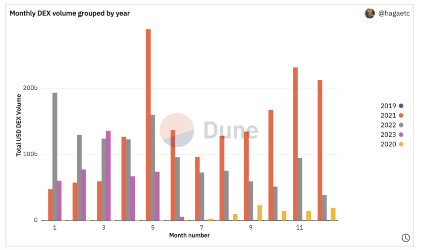 Combined DEX volumes rose to $74 billion in May from $67 billion the previous month, according to hagaetc’s Dune Analytics DEX volume dashboard.