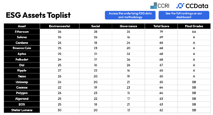 Ethereum topped the first institutional-grade crypto ESG ranking followed by Solana and Cardano, while Bitcoin lagged due to its heavy energy usage, according to crypto data firm CCData’s research.