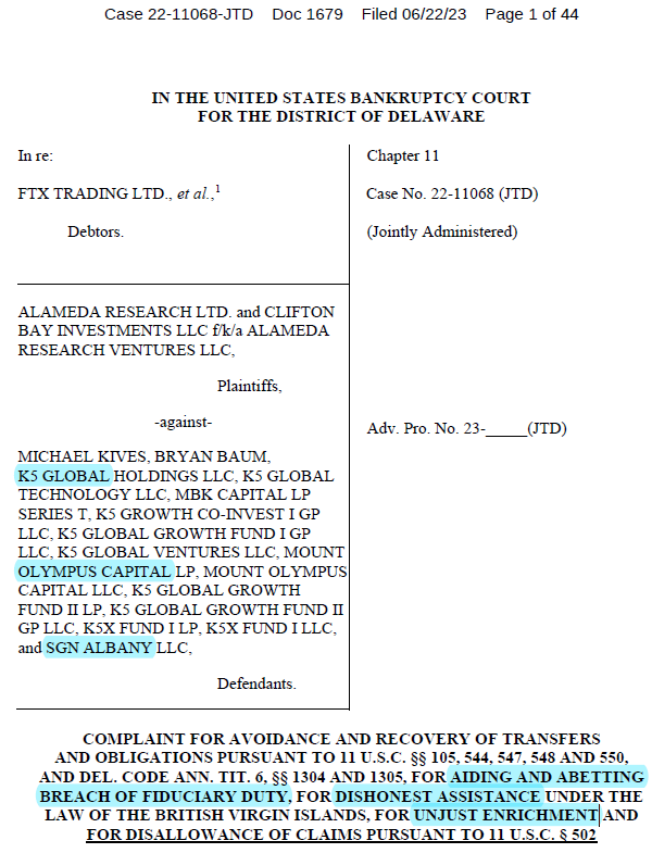The case, which was filed on June 22, includes 16 accusations and demands over $700 million in damages from the defendants. In the case, the defendants include incubator and investment companies K5 Global, Mount Olympus Capital, and SGN Albany Capital, as well as associated organizations and K5 Global co-owners Michael Kives and Bryan Baum.