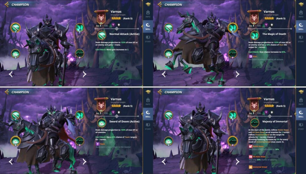 Champions Arena is a turn based, team combat, strategy game. Players field teams of up to four Champions and face off against their opponent. The Champions take turns performing attacks and actions until only one team is left. Players draw a hand of skill cards to start the game and an additional card each turn. Multiple copies of these cards can be combined to create a stronger card, adding an additional layer of strategy to the game.