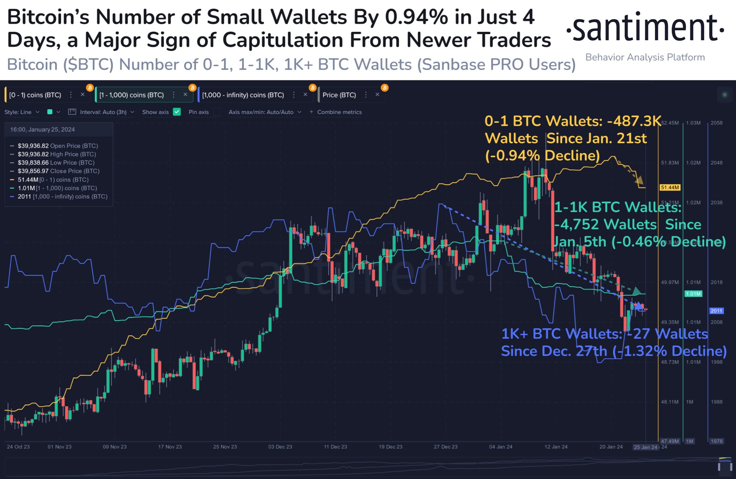 “The disappointment of market performances since the 11 ETF approvals over 2 weeks ago is largely attributed as the cause for these wallet liquidations,” Santiment adds.
