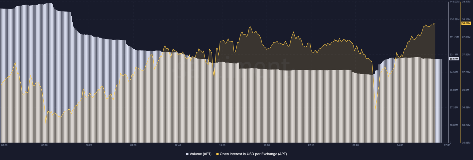 Another metric that supported the assertion was APT’s open interest per exchange. This metric describes the liquidity accompanied by the activity of traders in connection with a token.
