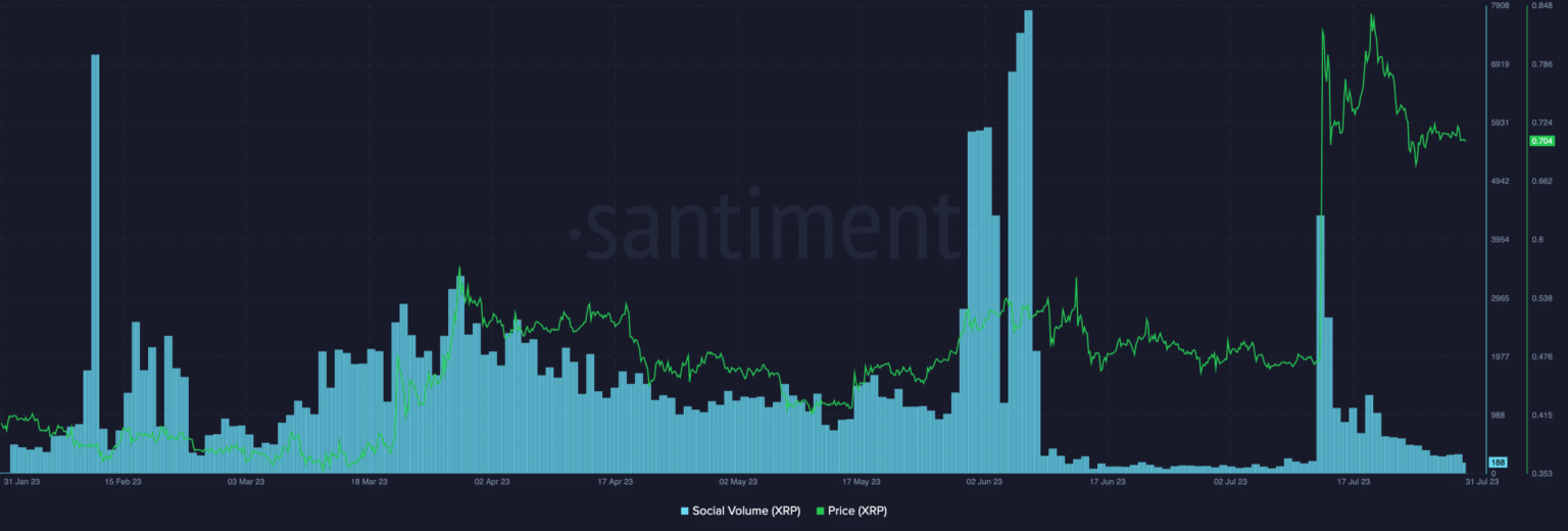 As a result of this sentiment, XRP’s social volume fell to 188. Social volume measures the number of search terms connected to an asset. So, the decrease in XRP’s social volume means that mentions about the asset were less than it was a few weeks back.
