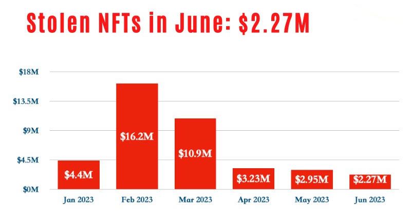 The highest month of 2023 for NFT thefts was February which saw $16.2 million worth pilfered. In the first half of the year, almost $40 million worth of NFTs have been stolen.