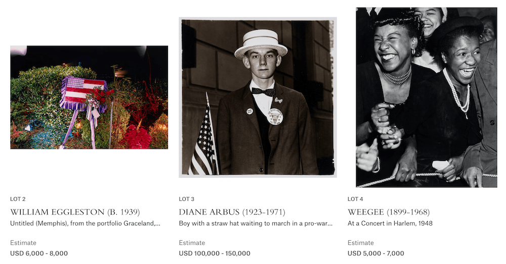 Works created after World War II and contemporary masterpieces will be the mainstay of the auction, with lots that showcase the talents of iconic artists, including Diane Arbus, William Eggleston, Robert Frank, and Cindy Sherman.
