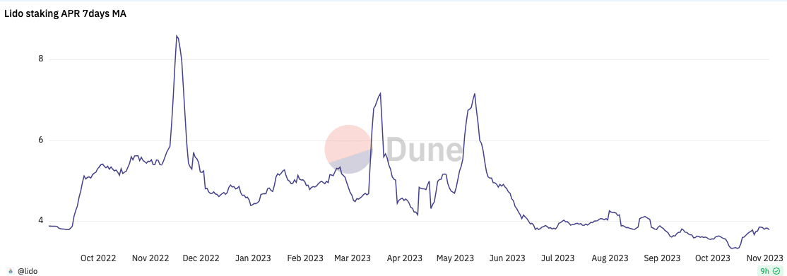According to Dune Analytics. Lido’s staking Annual Percentage Rate (APR) has been increasing since 17 October. The increase means that the adjusted liquidity deposited into Lido has improved.