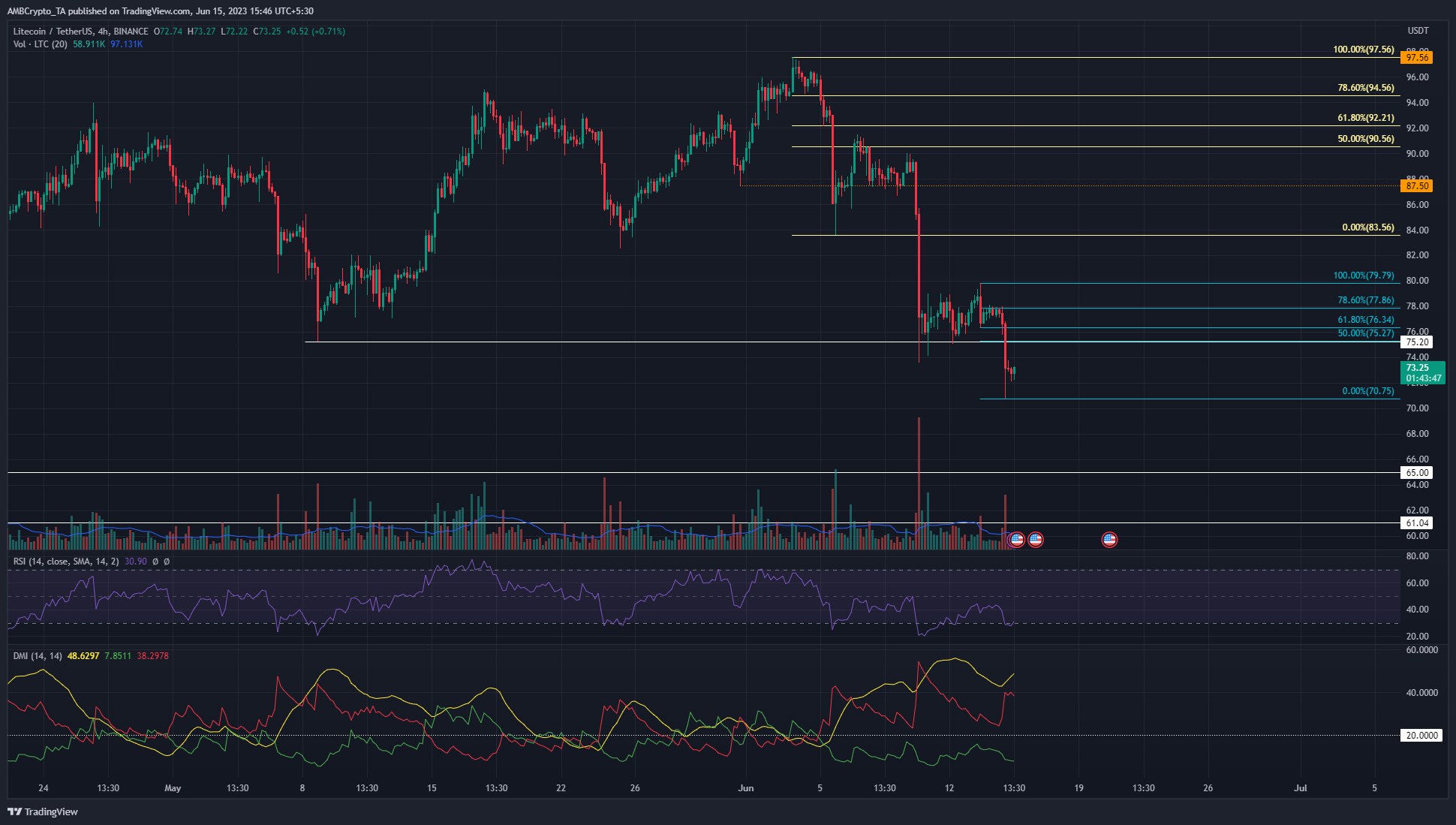 Similarly, the most recent move downward has its 50% retracement level at $75.2. This level was very close to the $75.27 level, significant on higher timeframes. Hence, a bounce into this area can be used to short Litecoin. Bearish targets include the March low at $65 and December 2022 low at $61.04.
