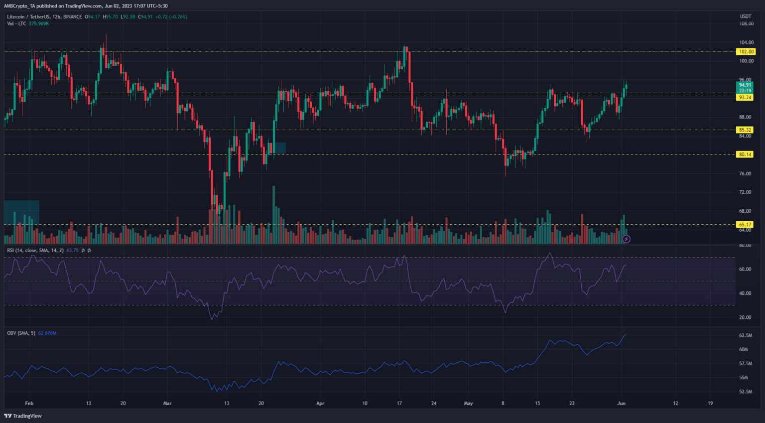 Litecoin [LTC] maintained its upward momentum, flipping the $93 resistance to support. LTC’s 6.5% gains in the past 24 hours saw it achieve a session close above the $93 resistance level.