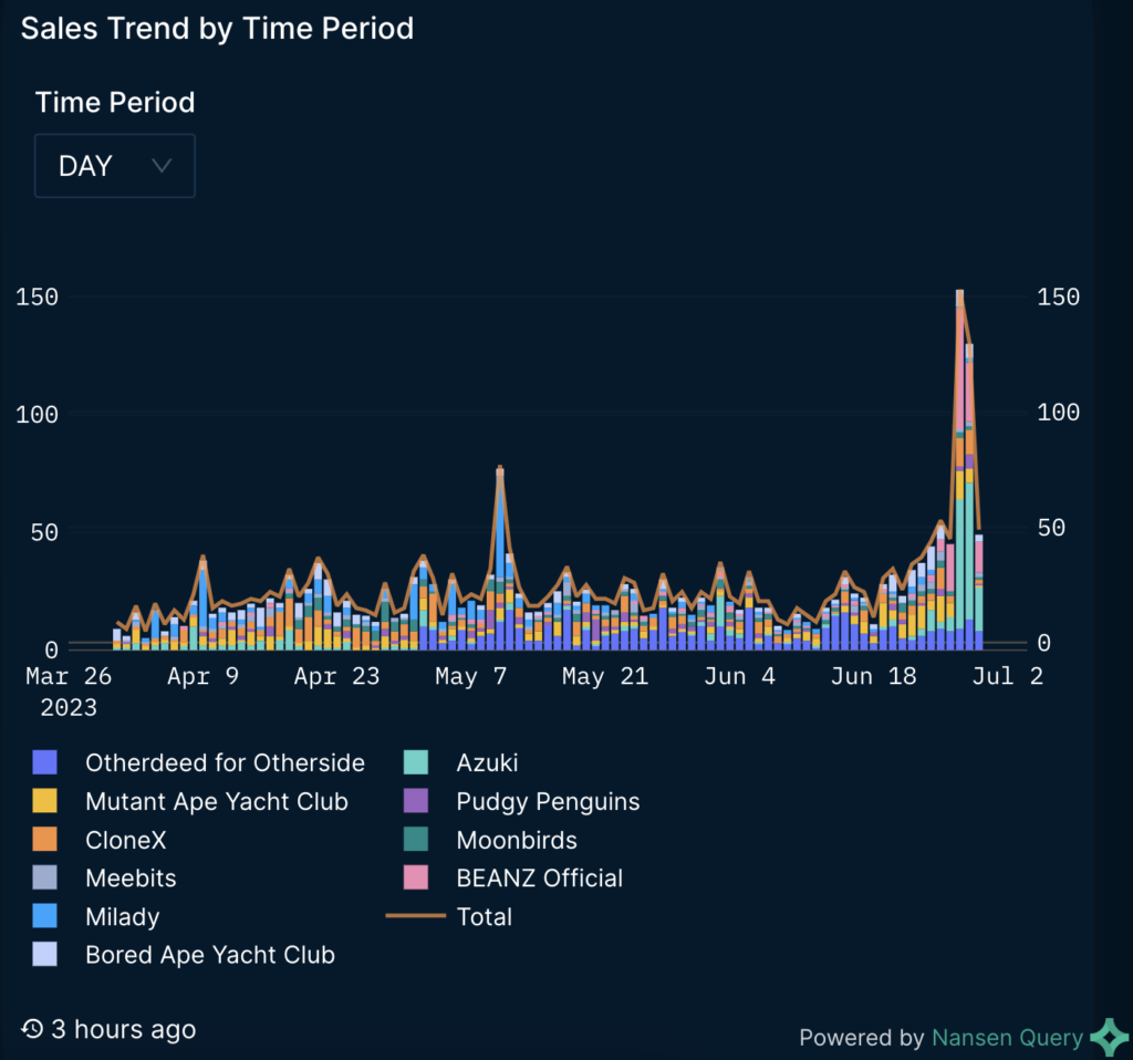 “The significant sell-off appears to be largely attributed to Blur’s lending platform,” said Brad Kay, research analyst at The Block Research. “Before the airdrop, Azuki and Beanz had 700 and 550 outstanding loans respectively. Following the Elemental minting, which triggered a flash sell-off, over 50% of outstanding loans were liquidated/repaid. While values have recovered to pre-airdrop levels, the substantial increase in supply may have catalyzed this cascade event.”