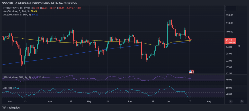Litecoin’s bearish outcome commenced after it dipped into the overbought territory at the start of July. The price, at press time, was in the Relative Strength Index (RSI)’s mid-range which means there might be some directional uncertainty. On the other hand, the Money Flow Index (MFI) hovered right above the overbought zone at the time of writing.