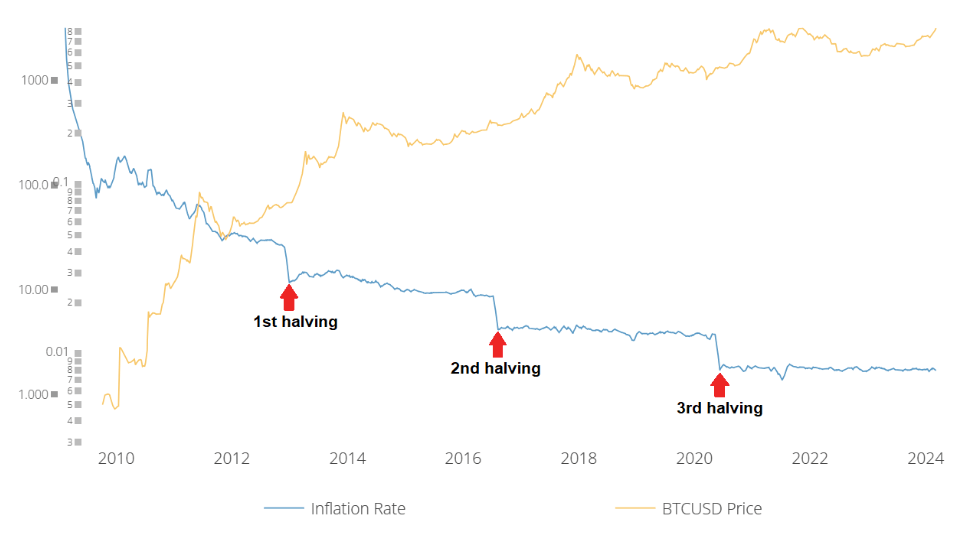 The stark difference in these rewards translates to Bitcoin’s inflation rate. From over 1,000% to present 1.7%, Bitcoin’s inflation rate will once again be cut in half. And as less BTC is available in the supply, each Bitcoin becomes more valuable.