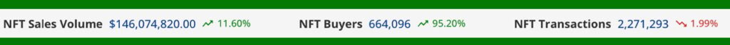 Despite a slight dip of 1.99% in the number of NFT transactions, which amounted to 2,271,293 last week, there has been a surge of over 95% in the number of NFT buyers. Statistics show approximately 664,096 buyers have been recorded in the past seven days.