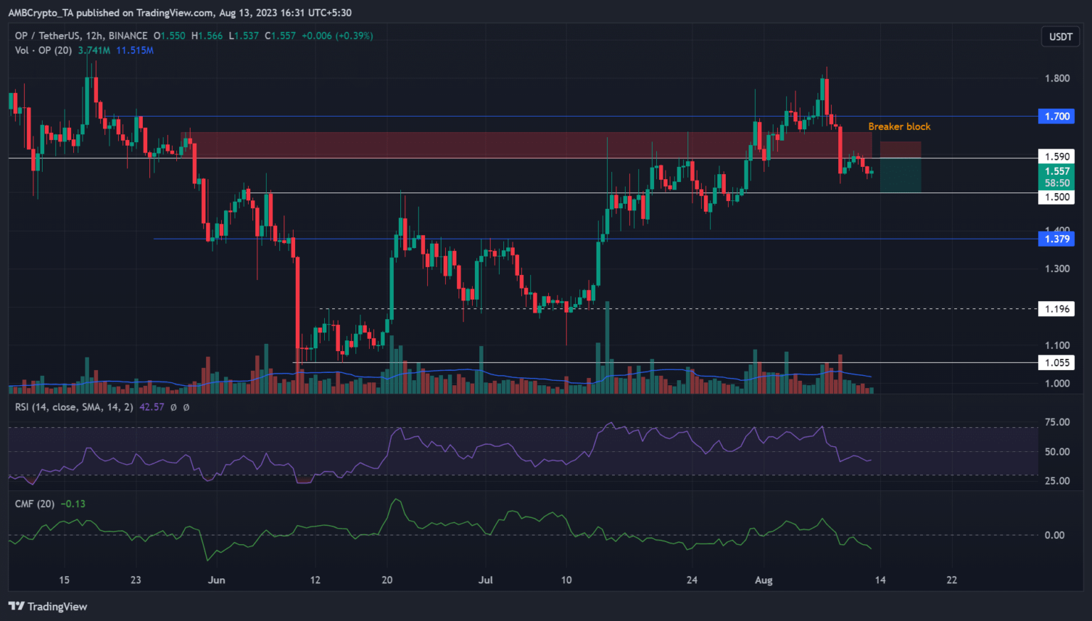 Optimism’s [OP] August losses threatened to turn the retracement into a downtrend. The altcoin shed over 15% of its value, dropping from $1.83 to $1.52 in two days (8-9 August). However, it consolidated the losses above $1.50, temporarily stopping the drop from turning into a downtrend.