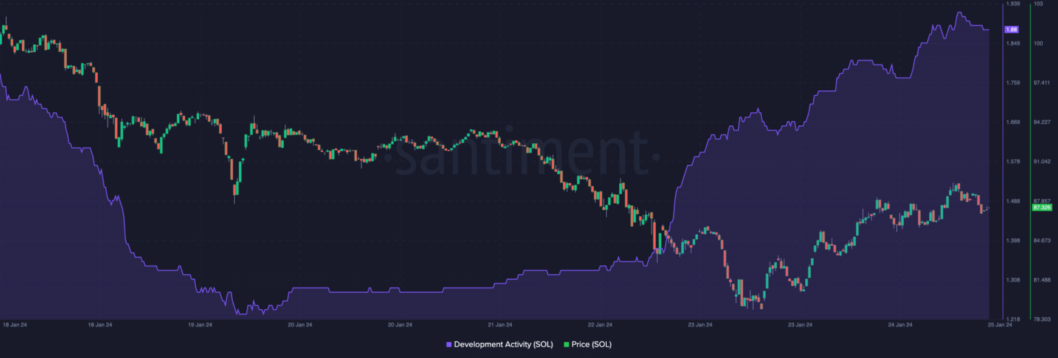 AMBCrypto checked if Solana’s development activity was in tune with its introduced feature. According to Santiment’s data, the development activity increased from 1.35 to 1.88 in the last five days.