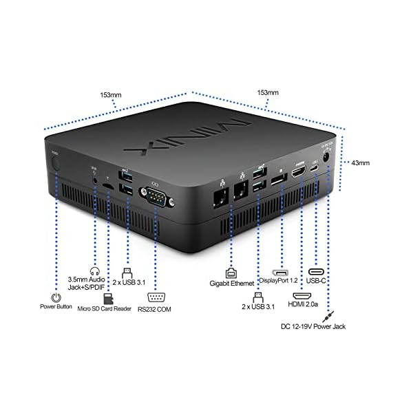 Powerfully Intelligent and Maximised Versatility. MINIX NGC-5 Mini Desktop computer with Intel Core i5 processor and Intel UHD 4K Graphics, 256GB M.2 NVMe SSD (Up to 2TB) and 8GB DDR4 RAM (Up to 32GB) that will enhance your computing experience with short boot times and fast application launches.You can get things done fast. This small computer designed for vivid entertainment, digital signage, and the workplace. Or simply a replacement for your home or office PC. Brilliant Triple 4K @ 60Hz Display Support. Three display outputs via HDMI 2.0a, DisplayPort 1.2 and USB-C, allowing simultaneous output on up to three screens in superb 4K ultra high definition. [Important Note: The integrated USB-C port only supports video output, not audio output]. Ideal for bringing exceptional colour, clarity and brilliance to your digital signage or kiosk, or being ultra-productive in the office with multitasking across multiple screens. Whisper Quiet Cooling for 24/7 Sustained Operation. MINIX NGC-5 Mini PC is built to last; intended for 24/7 sustained operation and attains reliable long-term operation even under the most strenuous tasks. With excellent integrated cooling, fan noise is minimal. It runs cool and whisper quiet while accomplishing breath-taking desktop level performance. Feature Rich for Commercial Applications. This mini computer pc is equipped with 1 x COM Port to support RS232, dual Gigabit Ethernet, HDMI 2.0a, DisplayPort 1.2, USB-C, 3.5mm Audio Jack+S/PDIF, 2x Dual Band Antenna and Kensington Lock which can be used for a variety of commercial applications. While the Micro SD card reader and four USB 3.1 ports increase productivity; move large files and connect peripheral accessories with ease. Important Note: