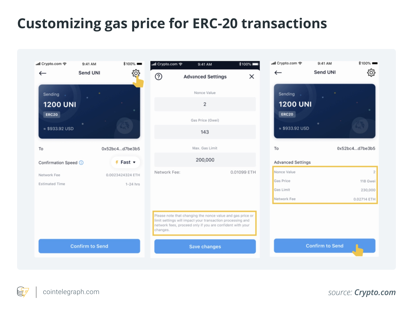 In addition, specific wallets, such as Trezor, allow users to “Bump Fee” on pending, unconfirmed transactions. Moreover, Crypto.com users can utilize advanced transaction settings to send Ether (ETH) or other ERC-20 tokens, allowing customization of the nonce value, gas price or gas limit. This feature, available in-app version 1.8.2 and above, empowers advanced users to tailor transaction parameters.
