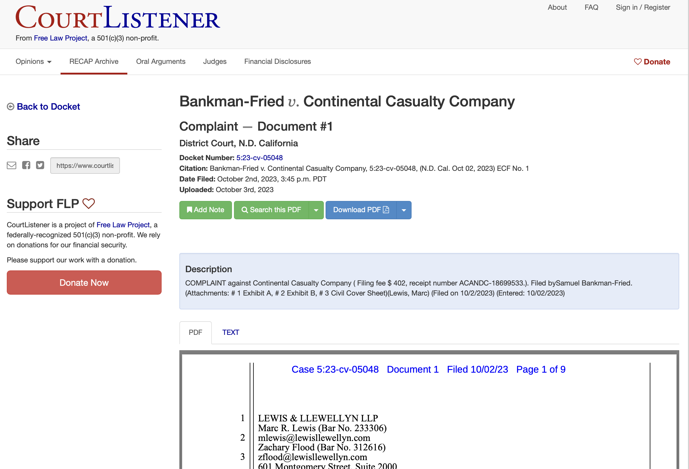 Sam Bankman-Fried’s complaint against Continental Casualty. Source: CourtListener
