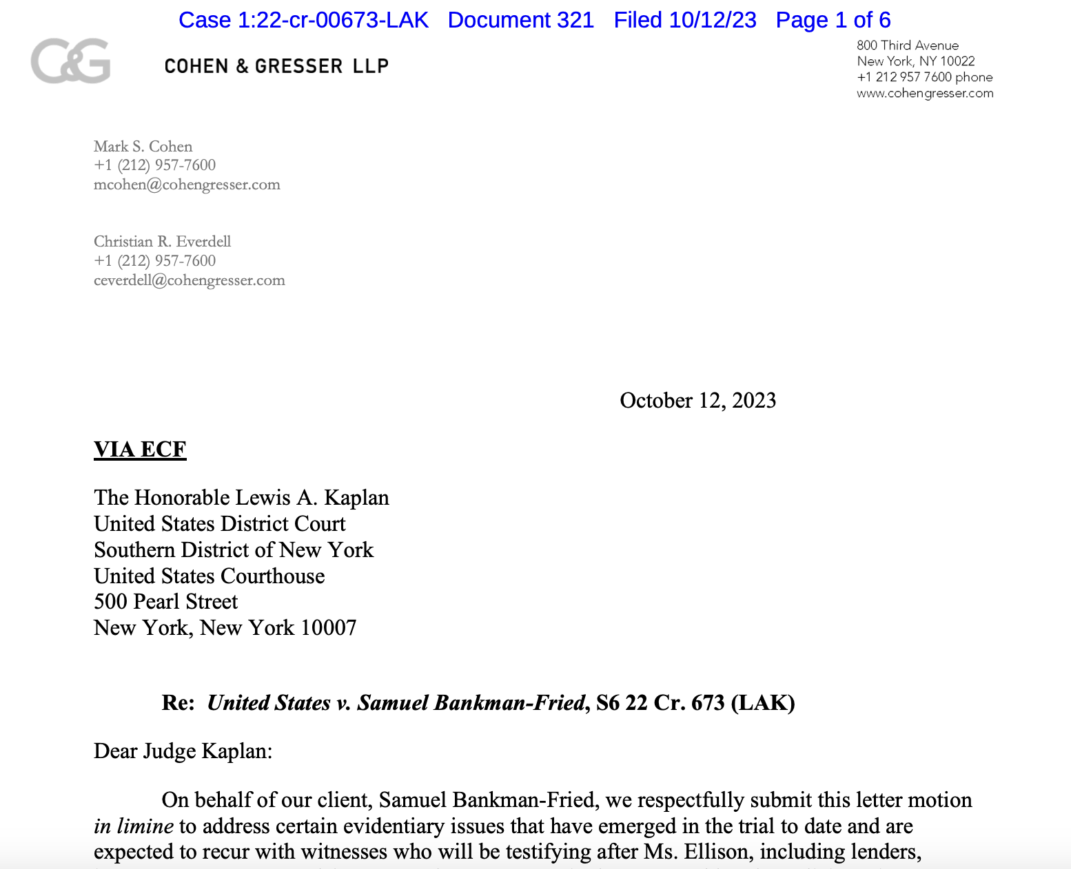 Oct. 12 filing by Sam Bankman-Fried’s team team in U.S. District Court for the Southern District of New York. Source: PACER