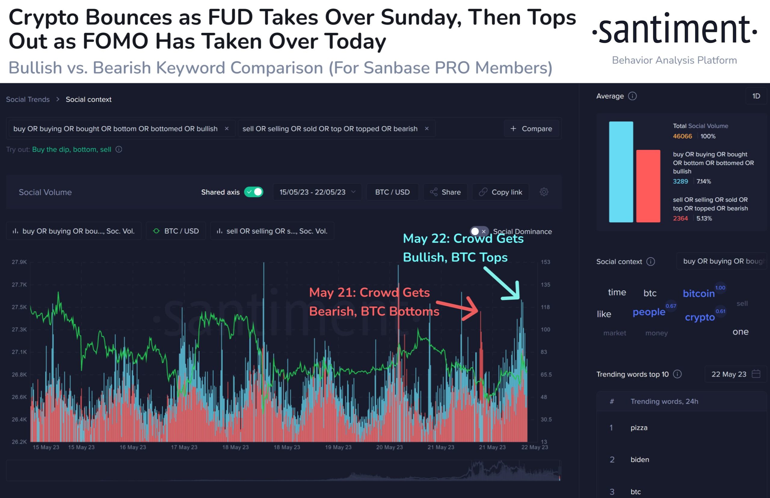 To use this indicator for pinpointing discussions related to market sentiment, the analytics firm first found the social volume of Bitcoin and cryptocurrency in general. Then it filtered it for some specific terms that refer to the investors’ mentality.