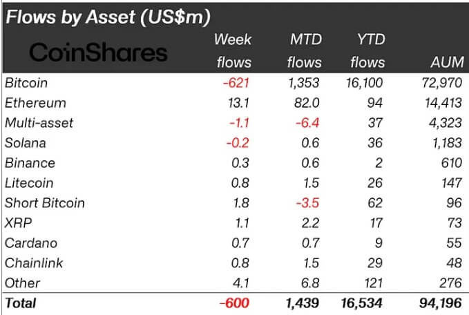 Last week, investors pulled $600 million from the market, with Bitcoin products bearing the brunt, facing $621 million in outflows.