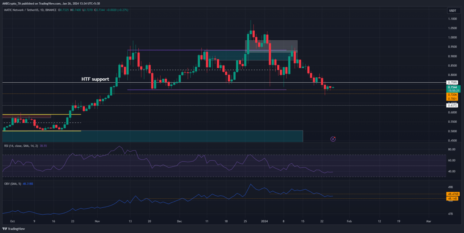 This was the level where the impulse move to the high at $1.09 was initiated. It is possible that the MATIC bulls can defend this HTF support zone, but Bitcoin [BTC] was also in a downtrend. Hence, traders have reason to be bearish.