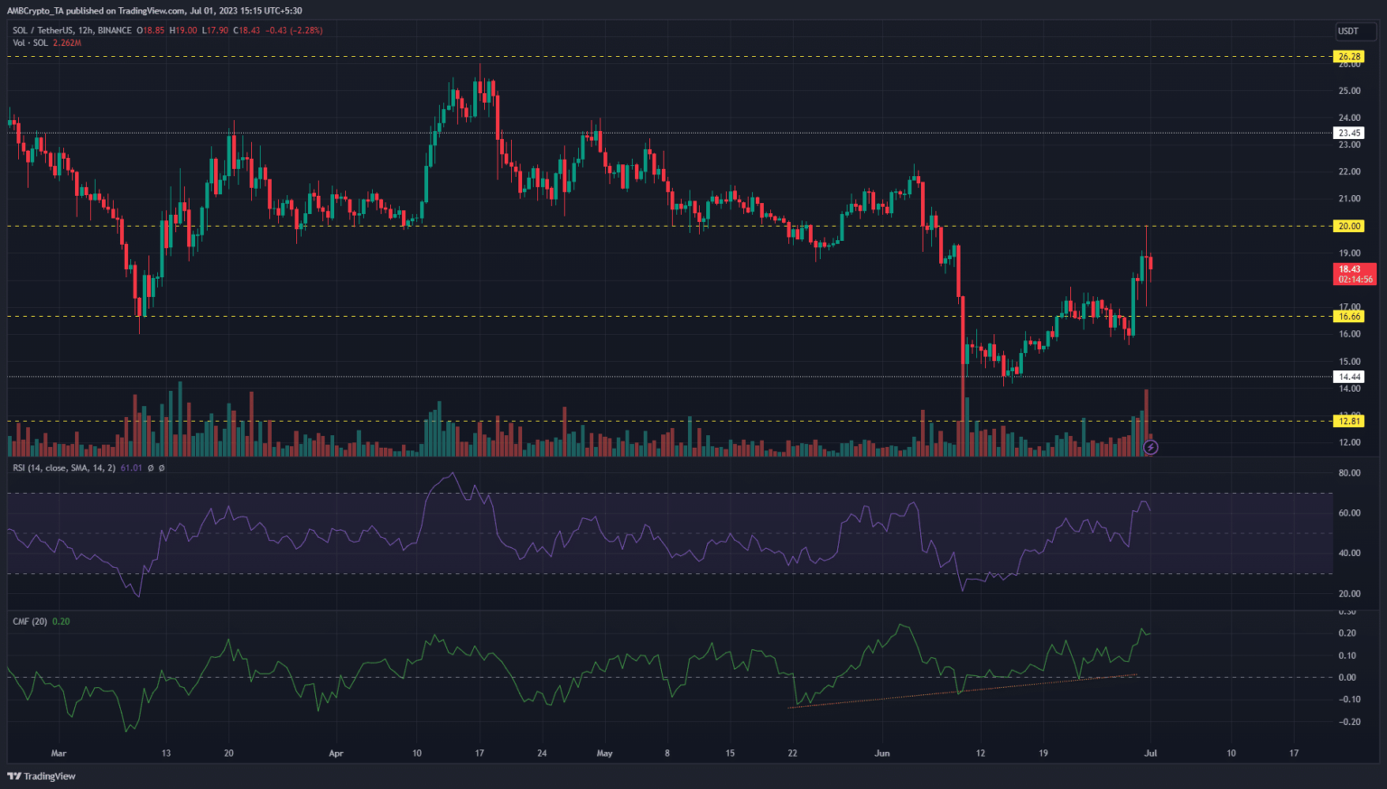 Like other altcoins, Solana has benefitted tremendously from a bullish Bitcoin. This has seen SOL rise from the June low of $12.81. Trading at $18.35, as of press time, this represented a 42% increase between 10 June and 30 June.