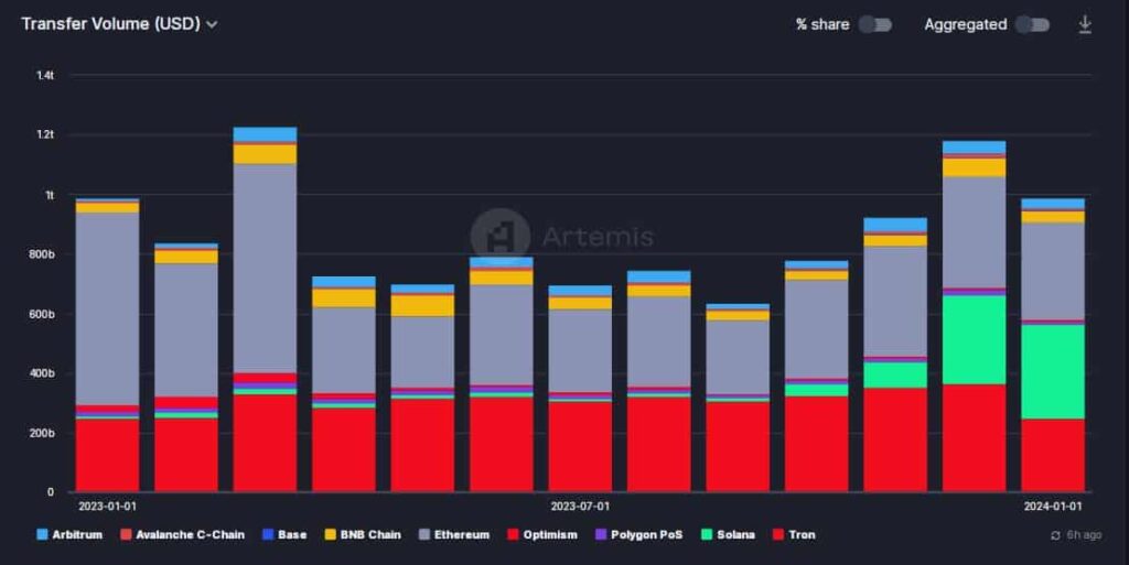 The transfer volume on Solana increased by 6% from the previous month, surpassing that of Tron [TRX] for the first time.