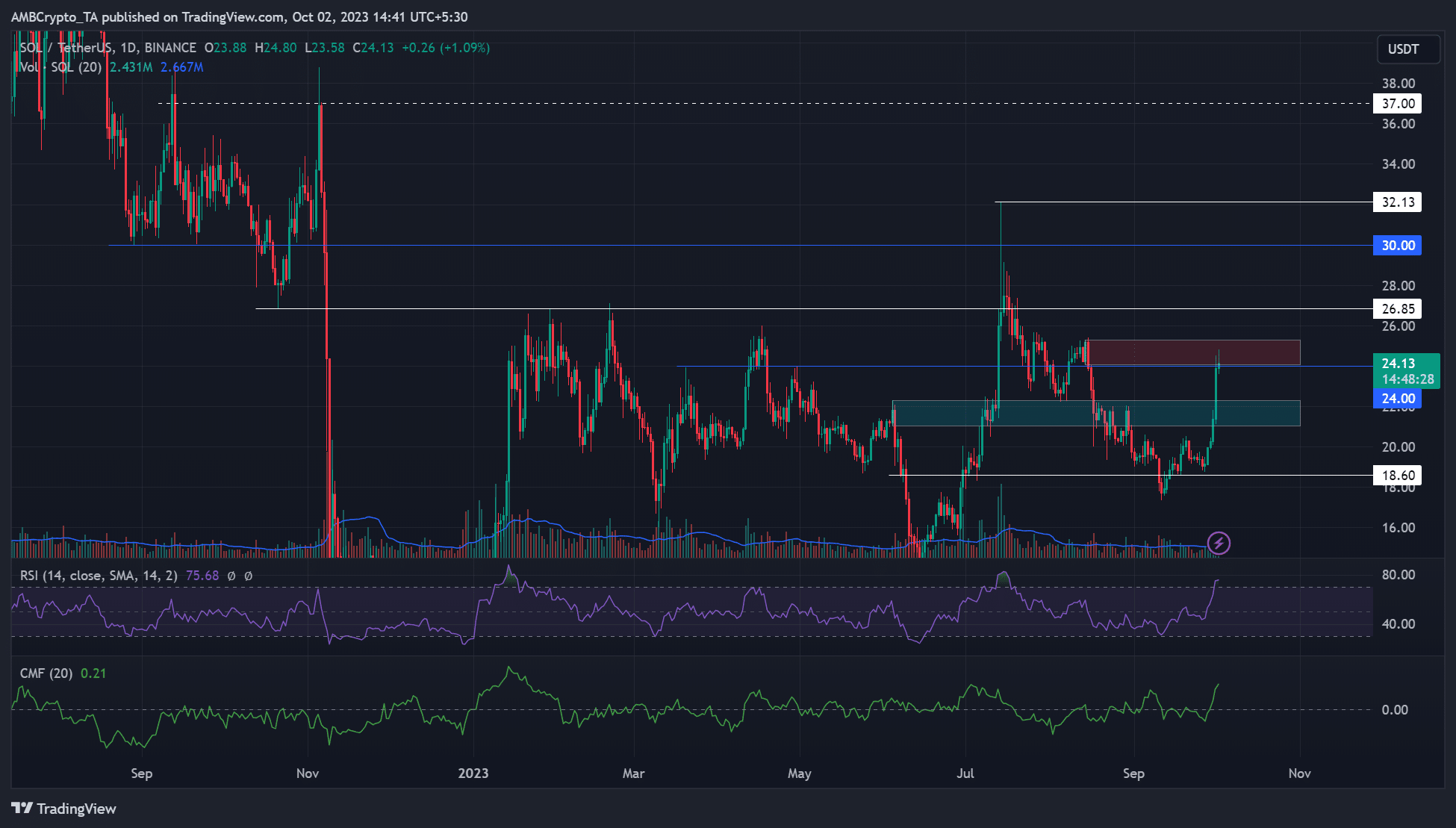 In the meantime, BTC also hit its range-high of $28.3k and was yet to front a bullish breakout as of press time. Until the bullish breakout occurs, SOL could derail at the $24 hurdle and could make the $21.0 – $22.3 (cyan), a key buying interest in case of a pullback.