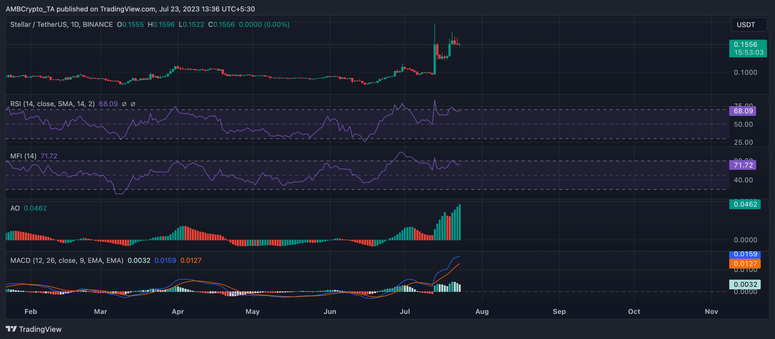 At press time, Stellar’s native token exchanged hands at $0.155. The token commenced a new bull cycle on 12 July, when the MACD line intersected the trend line in an upward direction. This crossover signaled the shift in momentum from bearish to bullish and confirmed the continuation of the existing price uptrend. XLM’s value has since gone up by 67%.